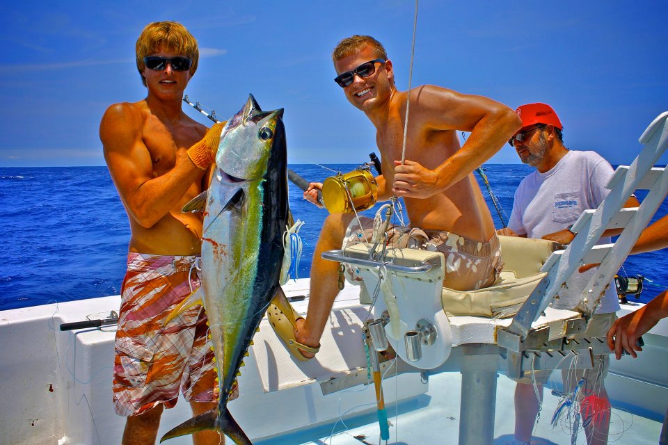 In April, Yellowfin Tuna is our main catch. Yellowfin tunas put up a great fight and are typically in big schools so multiple hookups are a common occurrence; It is not unusual to hook one on every line. There is also the chance to catch wahoo, dolphin (mahi), and Blue Marlin on our Hatteras Fishing Charters.